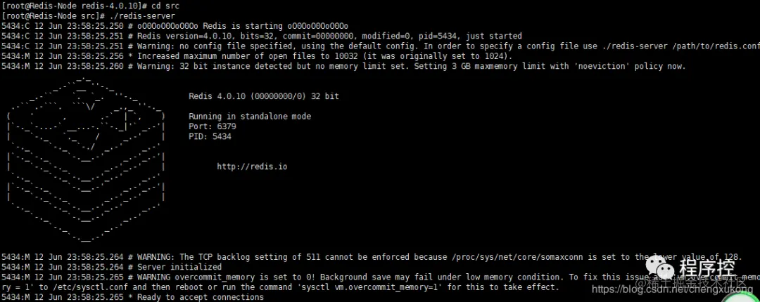 make完后 redis-4.0.10目录下会出现编译后的redis服务程序redis-server,还有用于测试的客户端程序redis-cli,两个程序位于安装目录 src 目录下,然后我们启动redis服务: