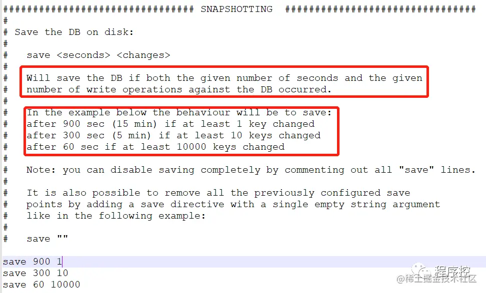 save 900 1的意思是:当时间到900秒时,如果redis数据发生了至少1次变化,则执行bgsave;save 300 10和save 60 10000同理。当三个save条件满足任意一个时,都会引起bgsave的调用