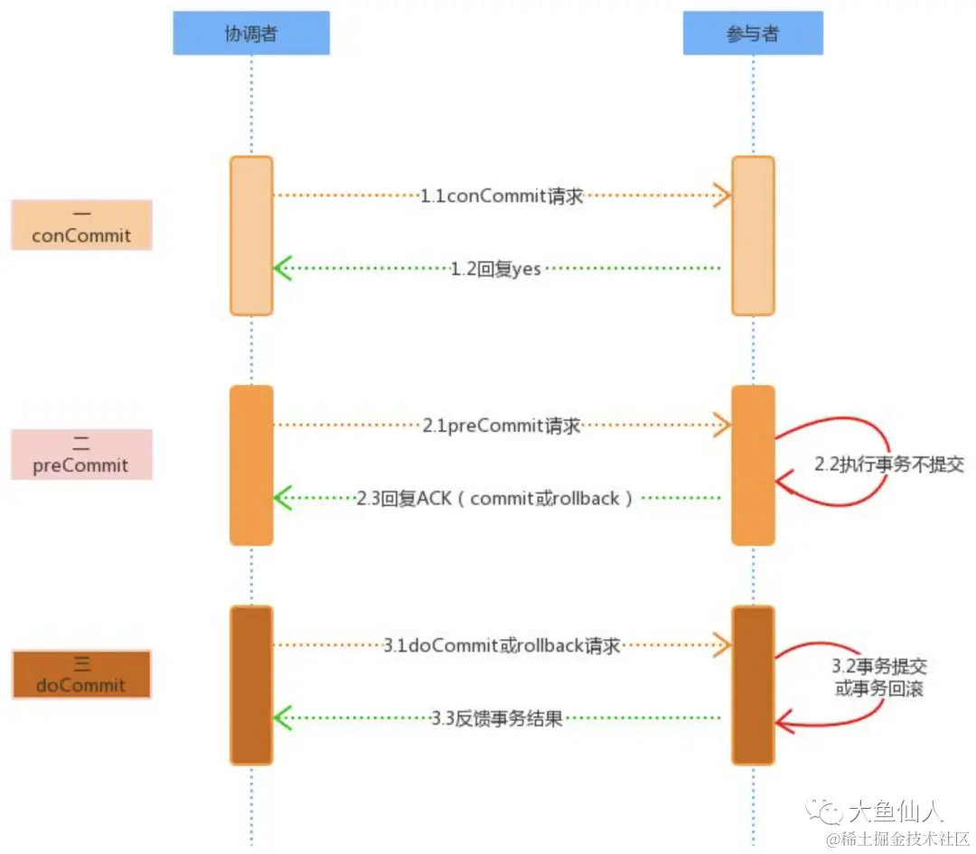 当然,这其中哪一个阶段的参与者返回失败都会宣布事务失败,这个2PC也是一样的,当然到最后的提交阶段和2PC一样都是只要是提交请求也就只能通过不断的重试咯