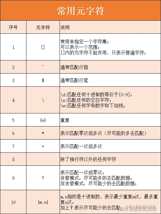 这里我给大家介绍10个常用的元字符以及它们的用法,这里我先给大家做1个简单的汇总,便于记忆,下面会挨个讲解每一个元字符的使用。