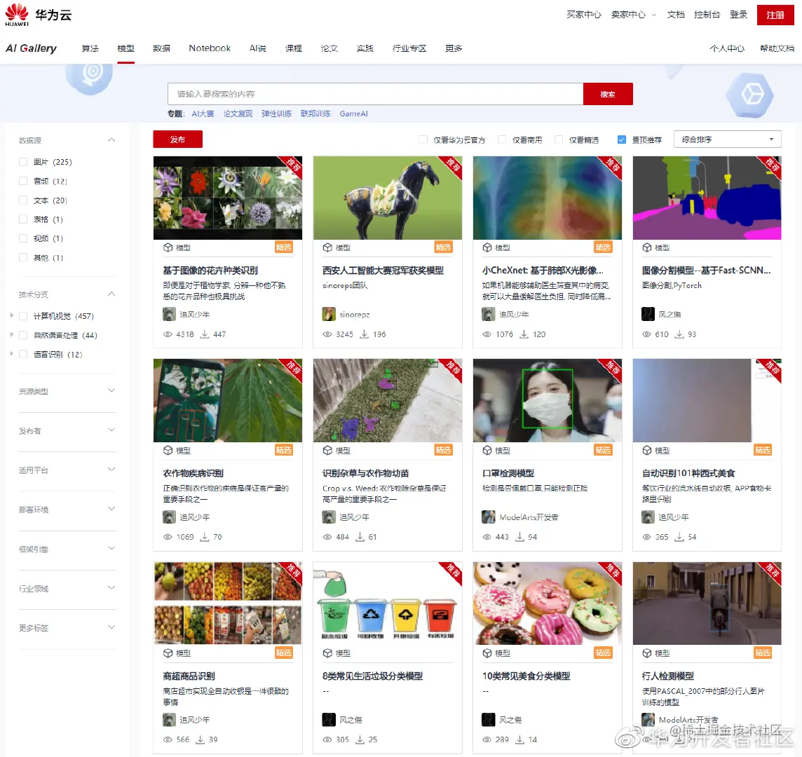 从上面的案例我们可以看到,利用华为云ModelArts的MLS工具可以非常便捷地完成机器学习建模。除此之外,对于AI开发者来说,丰富的资源也是必不可少的,毕竟大家都希望能在前人的基础上进行开发工作,而不是去做一些重复造轮子的事情,那么这里就不得不提一下华为云的AI知识&实训社区AIGallery了。