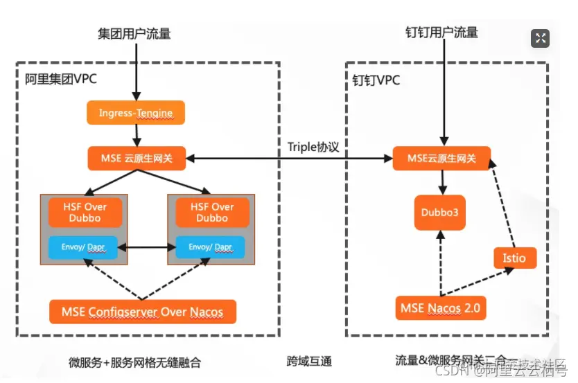 随着业务规模和业务域扩大,大公司基本都会遇到跨域互通的问题,阿里巴巴通过云原生网关打通多个业务域,如钉钉和其他集团业务域互通,通过MSE的云原生网关互通,通过Dubbo3.0的Triple协议互调,没有任何协议转化的消耗,效率高,rt低,还可以通过网关配置简单的路由切分逻辑提升整体高可用。在阿里巴巴落地服务网格过程中Istio不能满足阿里规模要求,因此服务链路直接跟Nacos注册中心打通,路由规则通过Istio对接Nacos配置中心打通,以便能够大规模生产落地。