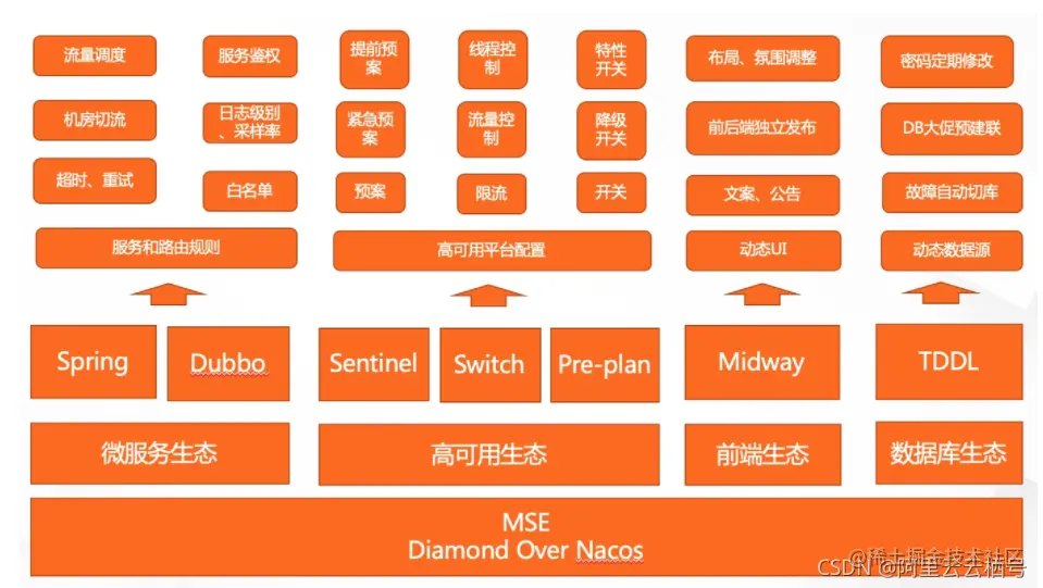 阿里能够喝着咖啡搞大促的一个底层技术就是动态配置管理+预案系统(定时修改规则配置)。Nacos作为动态配置管理的基础支撑着整个双十一的核心业务。 如阿里巴巴混部快速交付一个单元环境后,会动态推送单元化规则引流到新的混部环境,大促开始前会对日志采样率规则进行调整,防止过多日志对系统性能造成影响。