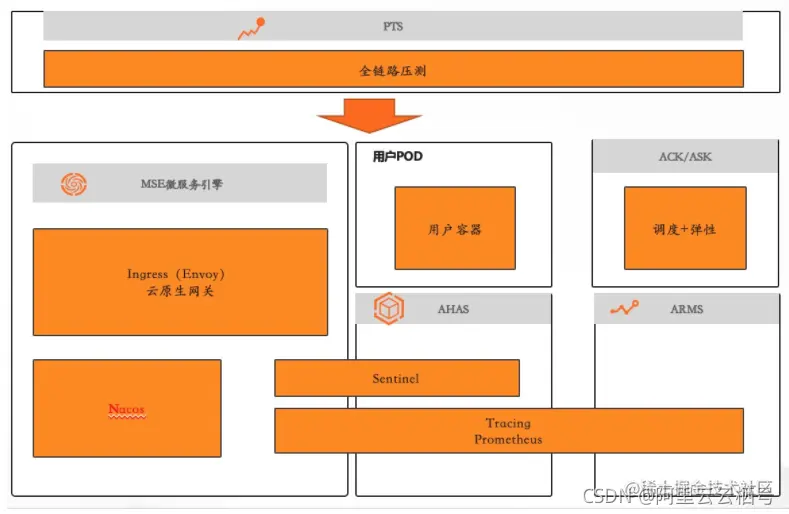 随着数字化进程的演进,很多公司跟阿里巴巴一样会搞大促活动,这样峰值流量可能压垮整个系统,导致巨大经济损失,如果准备过多资源会导致资源浪费。这种场景下可以采用阿里巴巴的PTS+MSE+AHAS+ARMS+ACK产品组合,边压、边限流、边看,边弹。通过PTS模拟用户流量做全链路压测,通过MSE中云原生网关做入口限流,并且通过Nacos发现后端服务转发,通过ARMS做服务可用性和服务治理观测,通过链路追踪分析超时、异常等问题,容量不够通过ACK弹性,从而在性能、高可用、和资源利用率之间做最大平衡。