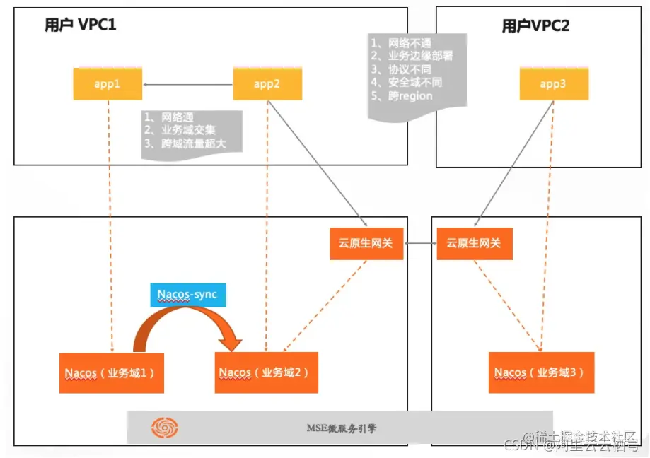 一般大公司都会有跨业务域、网络域、安全域、跨云等场景服务互通的需求,MSE云原生网关打通多个业务域,几乎所有用户都能用此方式解决,该模式通用,可管控,安全; 如果是一个网络域内,并且业务交集多,流量大,可以用Nacos-Sync组件做跨注册中心服务互通,跨域流量超过100w/s建议再考虑此种模式,该模式管控代价比较大,只能在网络互通、协议一致场景使用。 当然还有很多用户采用多注册和多订阅完成跨域互通,这样更无法管控跨域互通,风险无法识别,并且对研发有代价。