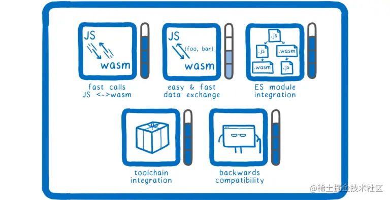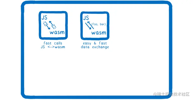 首先,我们需要 JS 和 WebAssembly 之间的快速调用,因为如果你将一个小模块集成到现有的 JS 系统中,你很有可能需要在两者之间进行大量调用。因此,你需要这些调用快速。