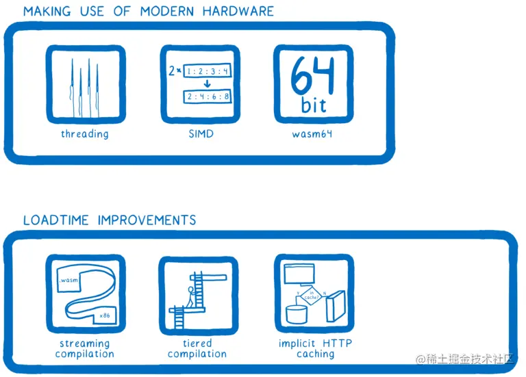 这意味着我们可以将编译后的代码存储在 HTTP 缓存中。然后当页面加载并去获取 .wasm 文件时,它只会从缓存中提取预编译的机器代码。这将完全跳过已经访问过的任何缓存页面的编译。
