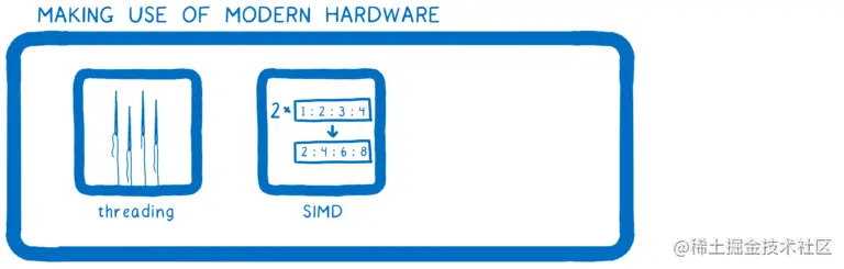 那就是 SIMD:单指令多数据。使用 SIMD,可以将一大块内存拆分到不同的执行单元中,这些单元有点像内核。然后会有相同的代码单元(即相同的指令)运行在所有这些执行单元上,但每个执行单元都将该指令应用于自己的数据位上。