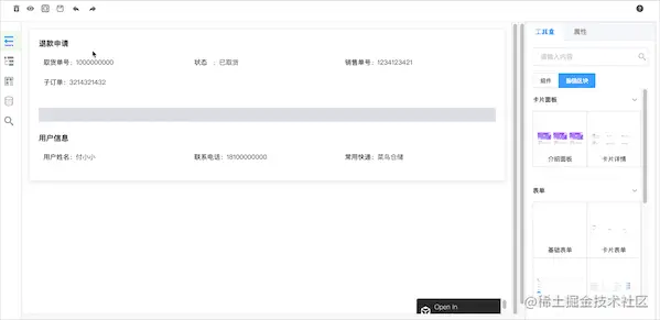 这个工作台类似于这样,包含组件、编辑区块、静态区块、搜索业务组件、插件、场景搭建编辑器。中间是预览区域,区域中的数据面板、账单详情都是通过右侧的组件拖过来的。
