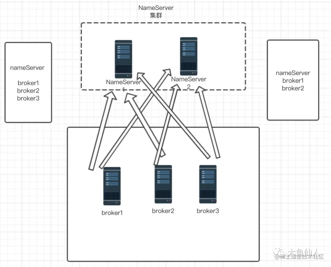 大鱼相信聪明的你应该已经猜到了,就是通过一个注册中心来控制,其实大鱼本人我在写这篇文章之前一直在纠结到底如何称呼NameServer在RocketMQ中的地位呢?