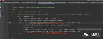 NameServer每隔10秒也会扫描所有存活着的broker的,这个时间也是无法更改的,若某个连接2分钟内(当前时间与最后更新时间差值超过2分钟,此时间无法更改)没有发送心跳数据,则断开连接,一旦连接断开,nameserver会感知,感知会有稍稍的延迟,为啥延迟我应该不用说了吧?