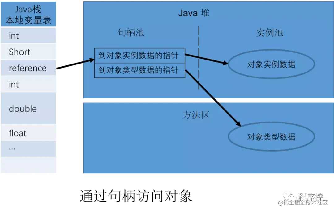 1、使用句柄:如下图所示,Java堆中划分出一块内存叫做句柄池,栈帧中存放的reference引用指向这个句柄池地址;句柄池中存放两类指针,一个是指向实例数据,实例数据位于堆中的其它区域。一个是指向对象类型,位于方法区中(方法区中存放的是类型信息啊)