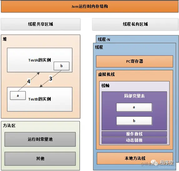 如上图所示,在线程的共享区域的堆中,TestA的实例b引用TestB的实例a,TestB的实例a引用反过来又引用TestA的实例b,如果此时直接把a和b分别置为null(此时栈帧空间的a和b变为null),但是在堆空间中的对象却是互相引用的关系,导致它们的引用计数器不为0,于是引用计数器算法无法通知GC收集器回收它们
