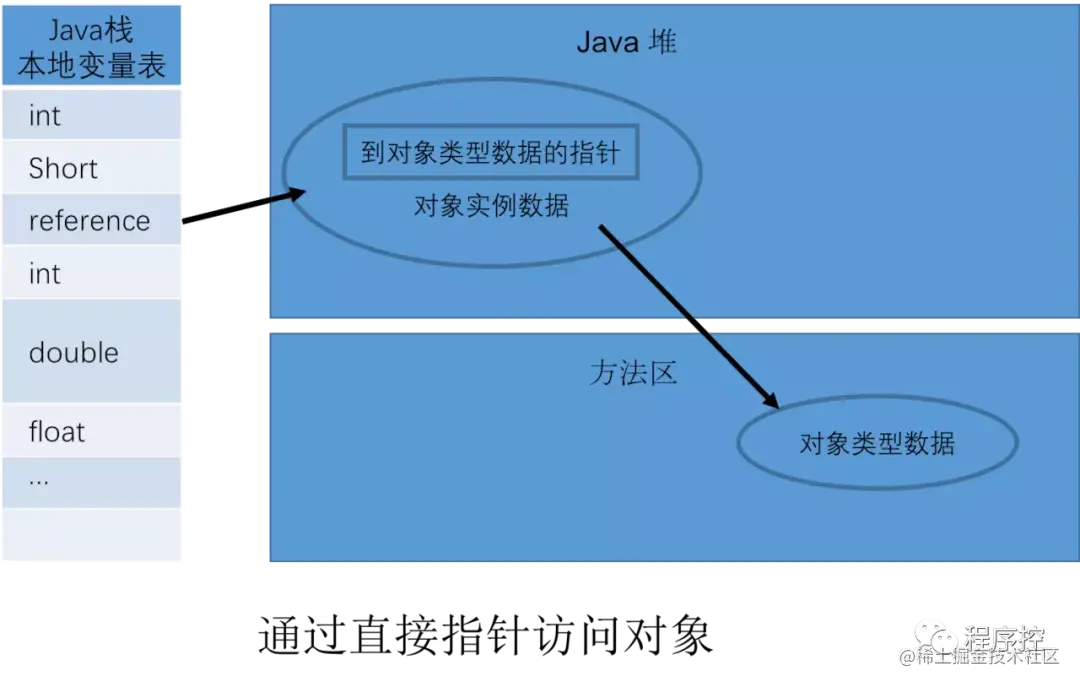 2、直接指针:如下图所示,栈帧中的reference引用直接指向Java堆中的实例数据,对象的对象头中的类型指针便指向方法区中的对象类型数据