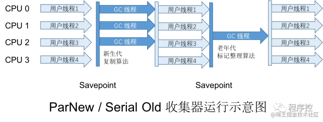 ParNew 收集器在单CPU的环境中绝对不会有比Serial收集器有更好的效果,甚至由于存在线程交互的开销,该收集器在通过超线程技术实现的两个CPU的环境中都不能百分之百地保证可以超越。在 多CPU环境下,随着CPU的数量增加,它对于GC时系统资源的有效利用是很有好处的。它默认开启的收集线程数与CPU的数量相同,在CPU非常多的情况下可使用 -XX:ParallerGCThreads参数设置