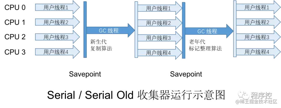 Serial收集器是最基本、发展历史最悠久的收集器,曾是(JDK1.3.1之前)虚拟机新生代收集的唯一选择。Serial是一个单线程收集器,它只会使用一个CPU或一条收集器线程来完成垃圾收集工作,更重要的是它在垃圾收集的时候,必须暂停掉其它所有的工作线程,直到它结束为止(Stop The World)