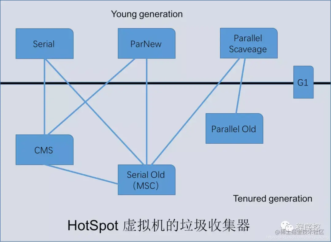 收集算法是内存回收的理论,而垃圾回收器是内存回收的实践。如下图所示,如果两个收集器之间存在连线说明他们之间可以搭配使用。虚拟机所在的区域则表示它是属于新生代收集器还是老年代收集器