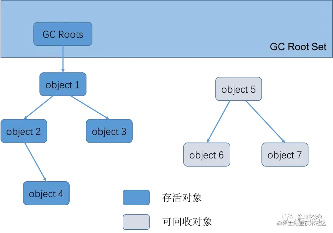 在主流商用语言的主流实现中,都是称通过可达性分析来判定对象是否存活的。这个算法的基本思想是通过一系列的称为“GC Roots”的对象作为起始点,从这些起始点所走过的路径称为引用链。当一个对象到“GCRoots”无任何引用链相连的时候,则证明此对象是不可用的。如下图所示,虽然object5、object6、object7之间互相有关联,但是GC Roots是不可达的,所以会被判定为可回收对象,也就解决了引用计数法中存在的问题