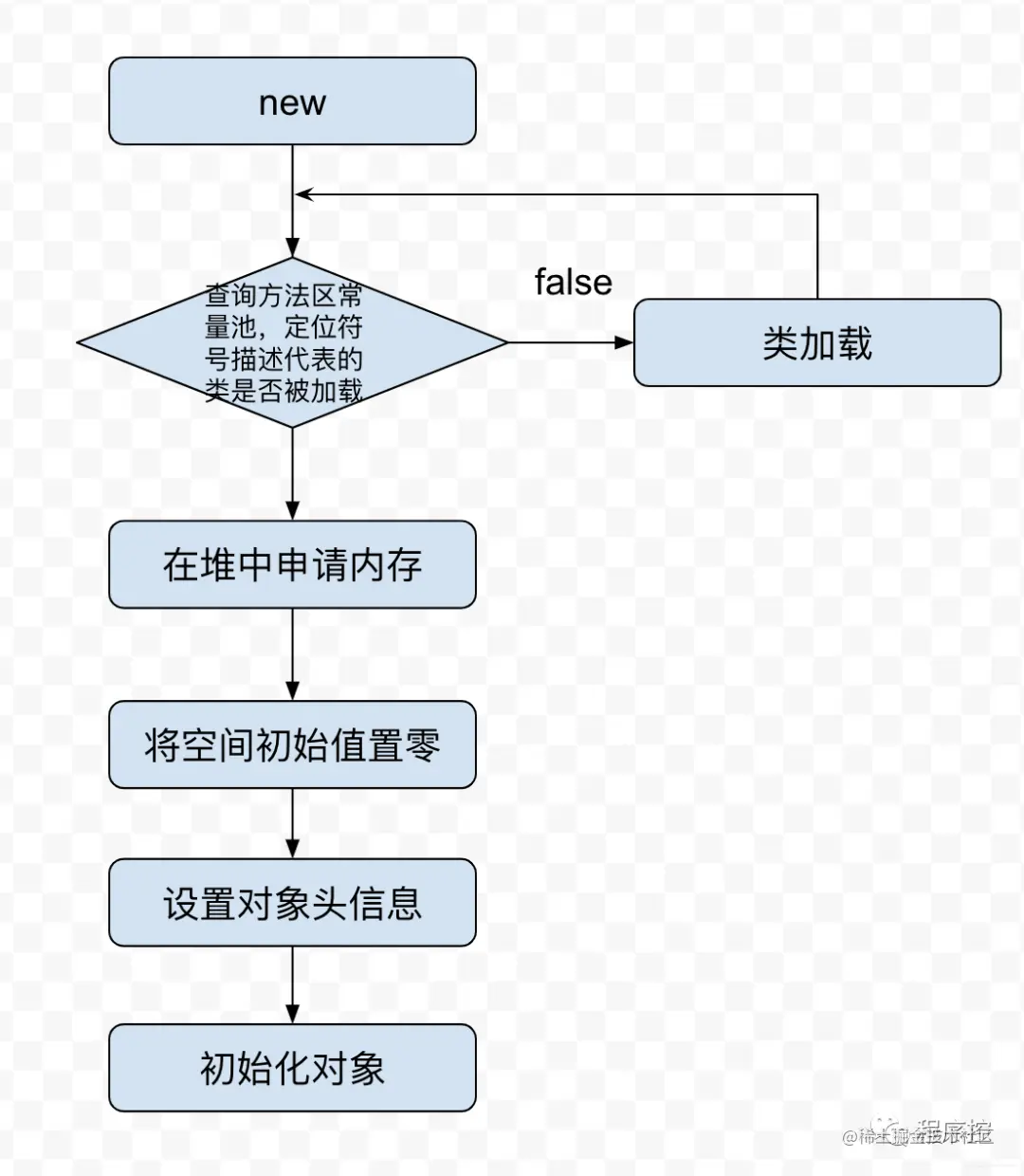 当虚拟机遇到new指令的时候,首先会去检查这个指令的参数是否能在常量池中定位到一个类的符号引用,并且检查这个符号引用代表的类是否已经被加载、解析和初始化过。如果没有,执行相应的类加载。(类的加载过程会在下面讲解)