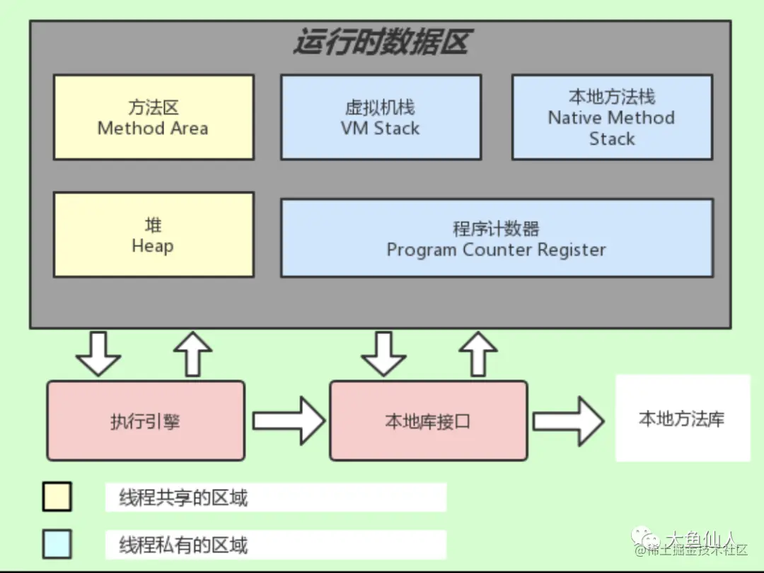如果你是读过JVM文章的养鱼仔的话,那你肯定看过上面类似的图,我在给大家放一张,大家在熟悉一遍,看过的回一下,没看过的混个脸熟