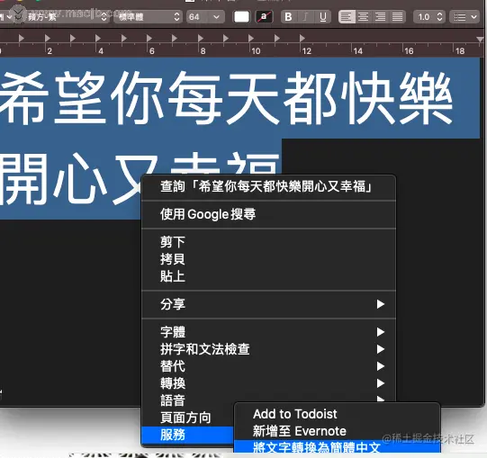 将所有文字全选起来,按一下右键,选择「服务」>「将文字转换为简体中文/繁体中文」。