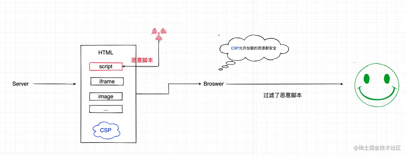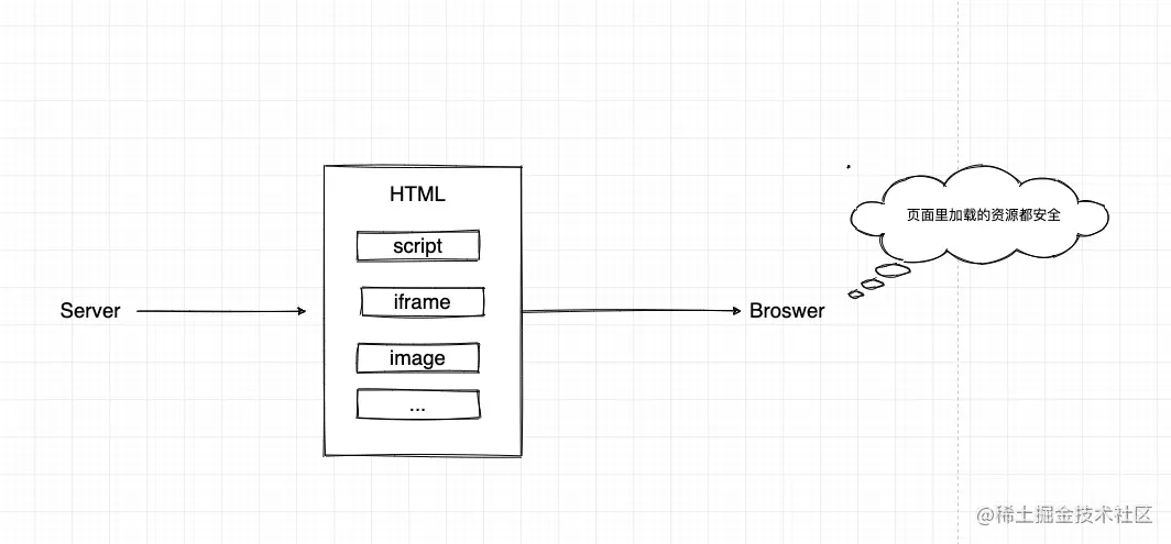 比如说,对于没有设置CSP的浏览器来说,HTML文档加载的静态资源都会被浏览器认为安全的。