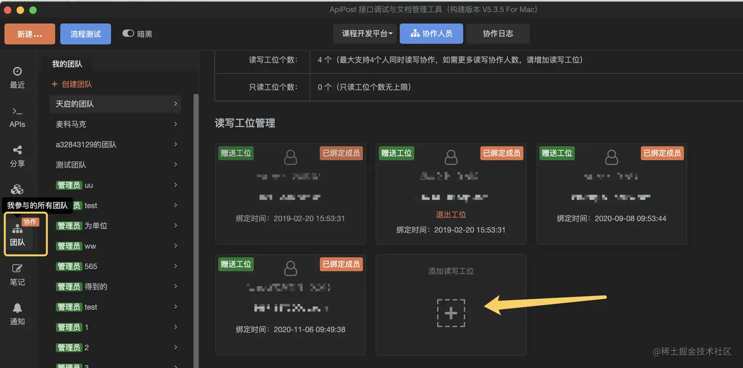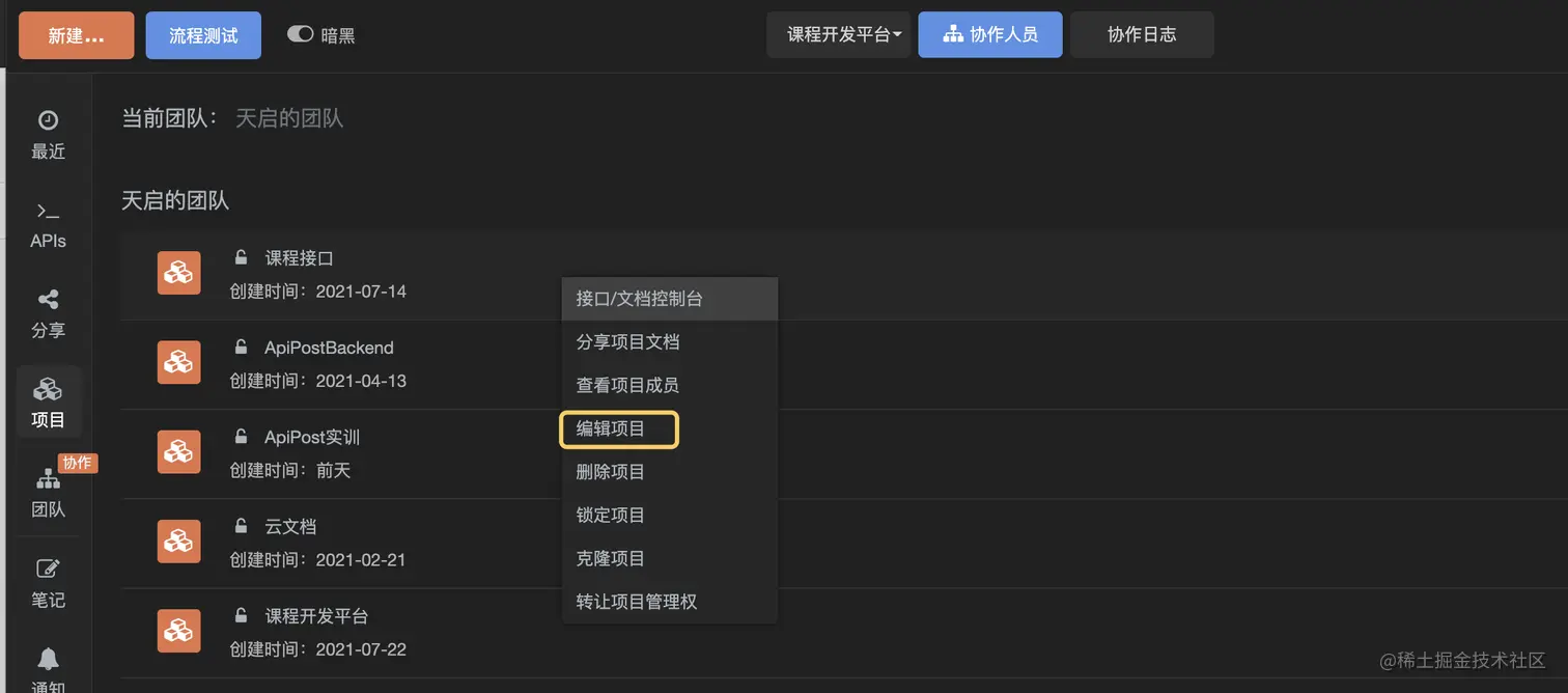 前后端协作的神器--apipost z初晴 2021-09-13 239 阅读1分钟 添加协作人员到项目的完整流程 添加协作人员到一个项目需要2步,绑定工位和添加到项目协作者。 绑定工位 操作路径:左侧“团队”——找到要操作的团队——找到空闲空位,点击“绑定工位”: 深入要协作人员的APIPOST账号即可绑定成功。 添加项目到协作者 点击左侧“项目”按钮,对着要添加协作人员的项目点击右键,选择“编辑项目”: 勾选需要添加的协作人员,保存即可。