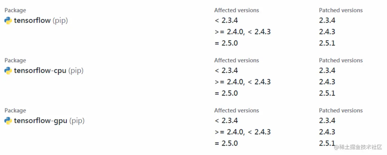 目前,TensorFlow也已发布了该漏洞的补丁,受影响的版本和修复版本如下所示: