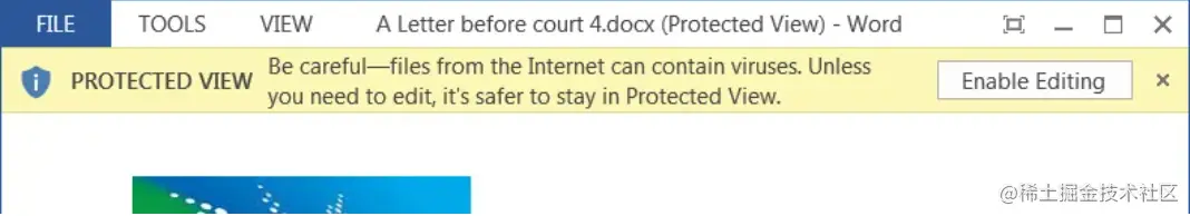当office打开一个文档后,会检查是否标记为"Mark of the Web" (MoTW),这表示它来源于互联网。如果该标签存在,微软就会以只读模式打开该文档,除非用户点击启用编辑按钮。