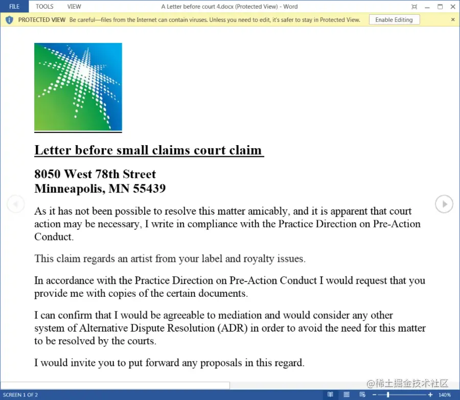 因为该文件是从互联网下载的,会被标记为Mark of the web,会在word保护视图打开。