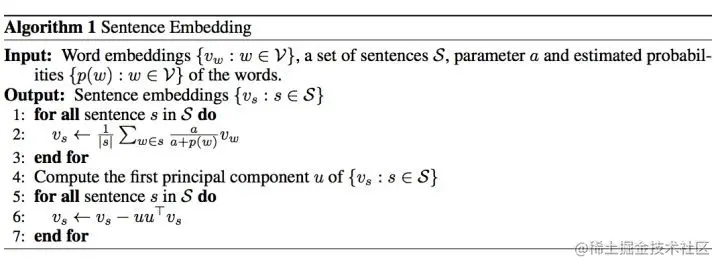 首先整个算法的输入有: (1) 每个词语的词向量 (2) 语料库中全体句子 (3) 可调参数a (4) 每个词语estimated probability