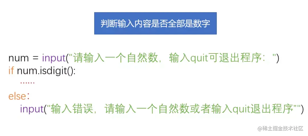 还要解决一个问题,就是如何判断学生输入的内容是否是自然数。自然数都是由数字组成的,程序只需要判断学生输入的内容是否全部是数字就可以,如果全部是数字,再使用int函数将输入的内容转换为整数即可。