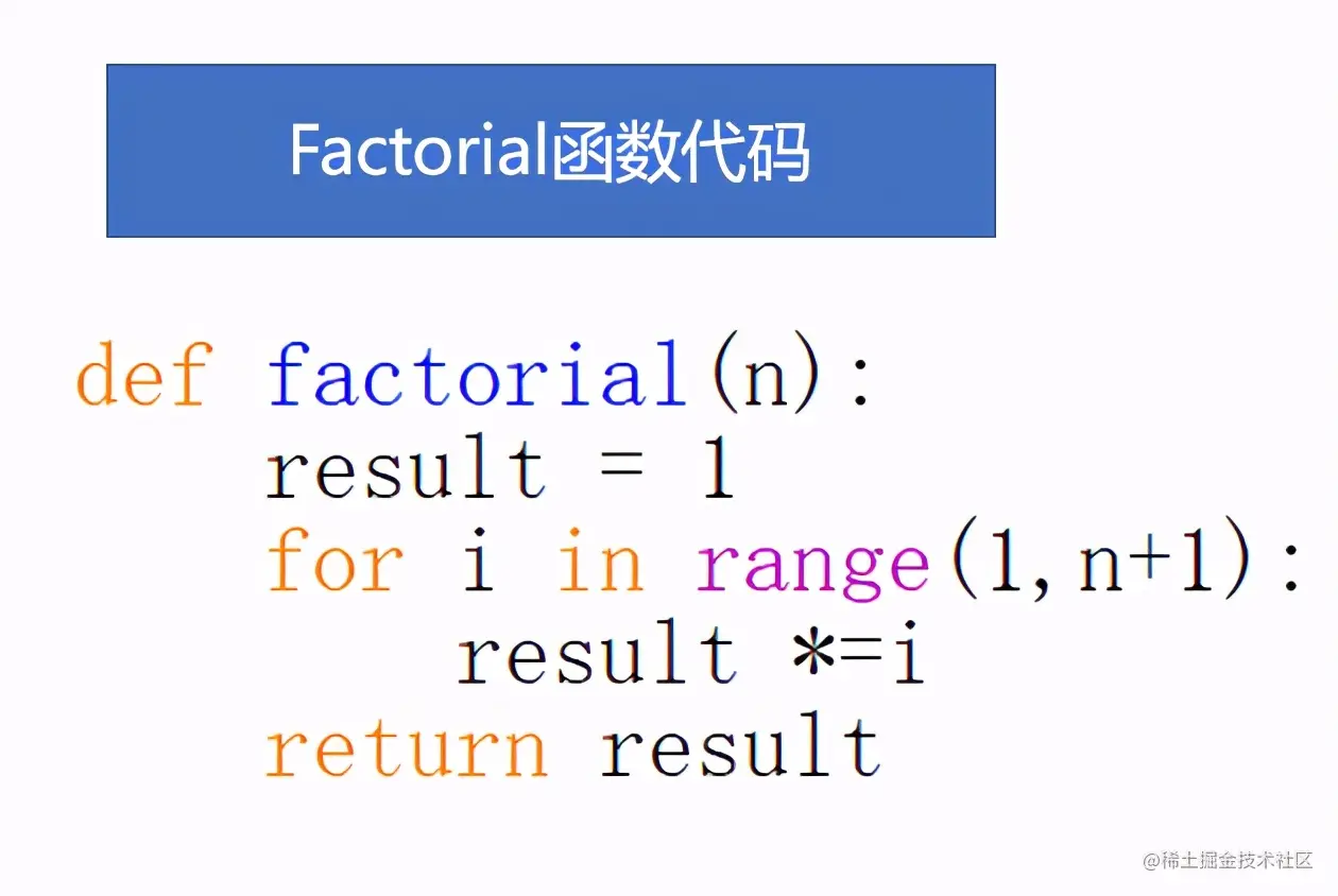 factorial是定义的阶乘函数,用于计算自然数n的阶乘,该函数有一个参数n,调用该函数时需要传入参数n。