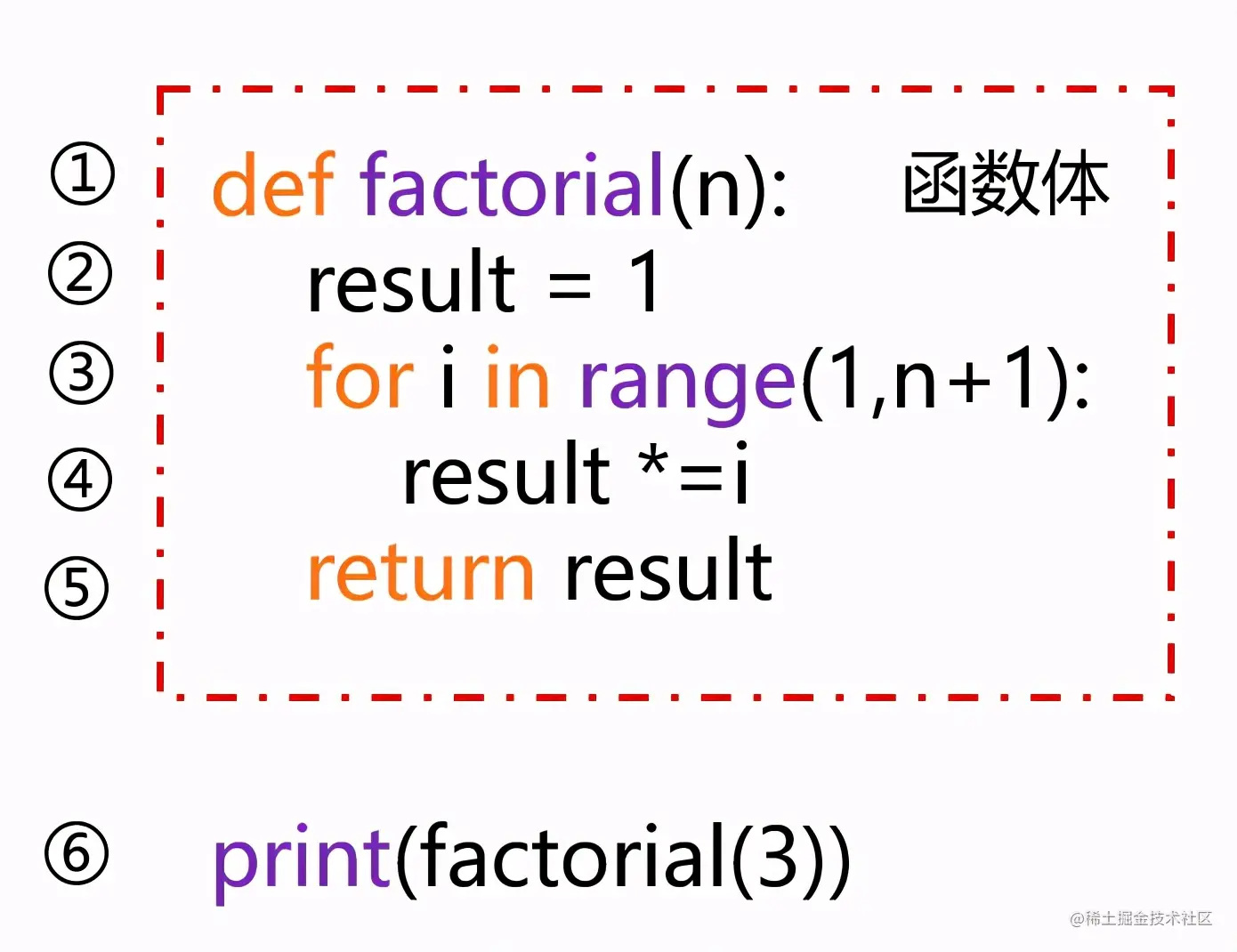当代码包含定义的函数时,Python解释器不会自动执行函数代码,只有代码中的语句调用函数时,Python才会执行函数代码。因此上面的程序运行后,会先执行第6条语句,第6条语句调用了factorial函数,Python解释器再执行factorial函数代码。