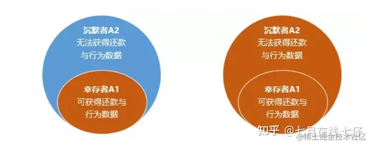 用下图示意的话,在客户全集为A的情况下,放款机构仅能通过分析子集幸存者A1的还款与行为数据寻找区分客户好坏的标签,但却不得不把这种标签推广应用在包括子集沉默者A2在内的全集上,而从A1取得的好坏标签在A2中可能并不成立。