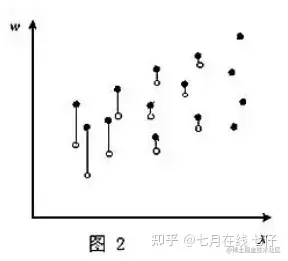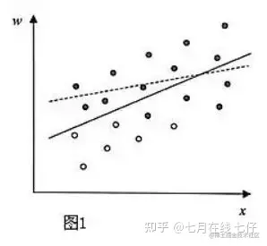 Heckman 在1974年发表的《Shadow Price, Market Wages and Labor Supply》(影子价格、市场工资与劳动供给)中研究了工资与教育程度的关系。很显然,研究者只可能从有工作的人们那儿获得有关工资的数据。根据这些数据,研究者可以绘制成下图这样的分布图。图1中W表示工资,X表示受教育程度,可获得工资数据是图中的实心点。这样,我们研究所得到的两者的关系就如虚线所示。