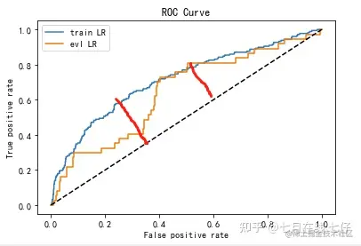 下图中两条红线分别表示训练集和测试集KS的差距,看起来两者是差不多的,曲线下的面积表示的是两者的AUC值,很明显两者的AUC差的就很多了,由于ks值能找出模型中差异最大的一个分段,因此适合用于cut_off,像评分卡这种就很适合用ks值来评估。但是ks值只能反映出哪个分段是区分最大的,而不能总体反映出所有分段的效果,因此AUC值更能看出总体的效果。\