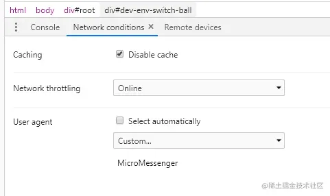 前端判断是否为微信环境 燎原火_ 2021-09-13 1,566 阅读1分钟 前端判断是否为微信环境的关键点是判断navigator.userAgent中是否有micromessenger字段 export const isEnvWeixin = navigator.userAgent .toLowerCase() .includes('micromessenger') chrome模拟微信环境