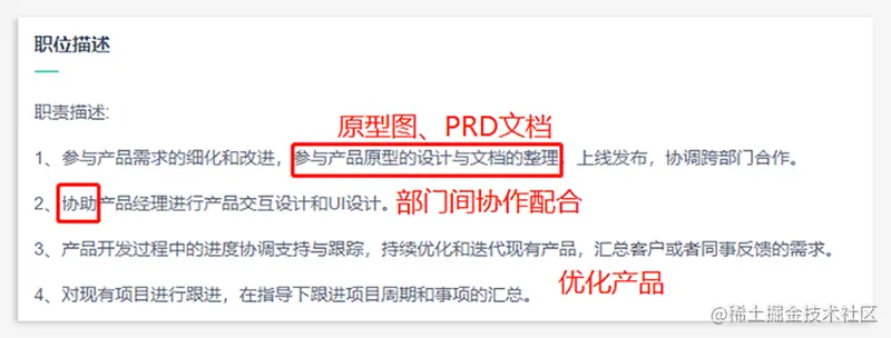 我认为,你第一步就应该先了解招聘单位对该岗位有哪些要求,然后再着手准备,这样更有方向和目标。下图是我在某网站看到关于产品助理岗位的职责描述,红字部分算是划重点了: