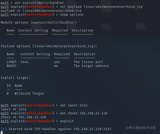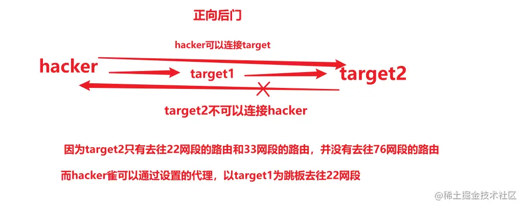 生成正向连接后门,Target2只能与target1 和target3进行通信,无法与kali进行通信,只能我们找他,不能他找我,因为我有去往他的路由,但是他没有我的路由,这就是正向后门的原理。