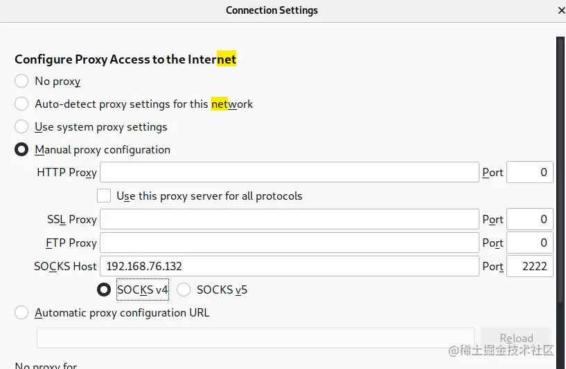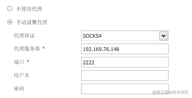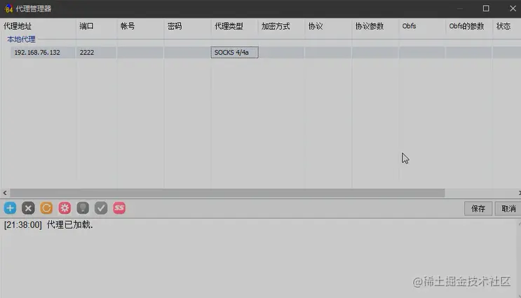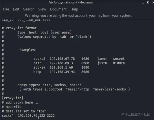 修改配置文件 /etc/proxychains.conf 添加 socks4 192.168.76.132 2222