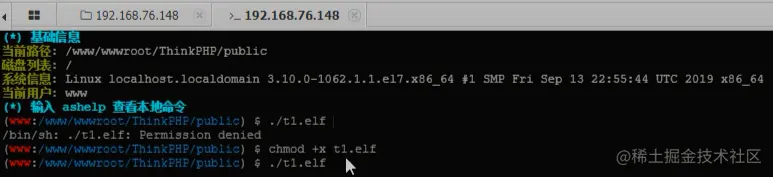 使用蚁剑进入虚拟终端,发现可以执行命令,执行t1.elf,第一开始权限被拒绝,赋予一个执行权限即可,t1.elf被成功执行。