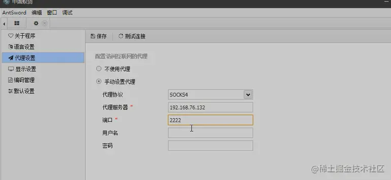 在蚁剑上重新设置代理, 此时蚁剑访问192.168.22.128时,使用msf中设置的2222代理端口进行访问。