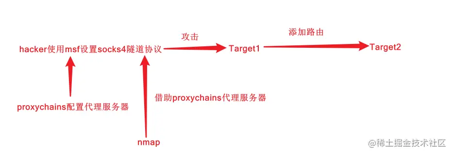 配置proxychains后,nmap借助proxychains代理服务器探针target2,这里需要重点掌握到底是如何进行攻击的。