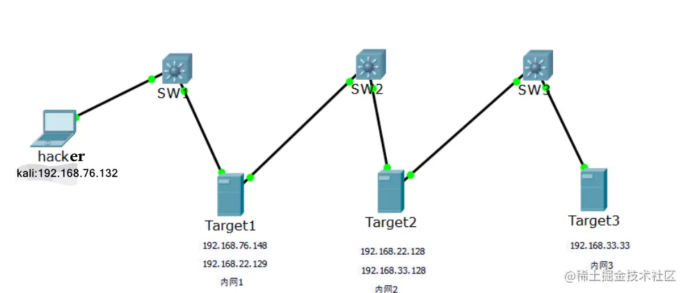 首先拿下Target1主机,以Target1为跳板,攻击Target2,攻击Target2后,再以它为跳板攻击Target3。