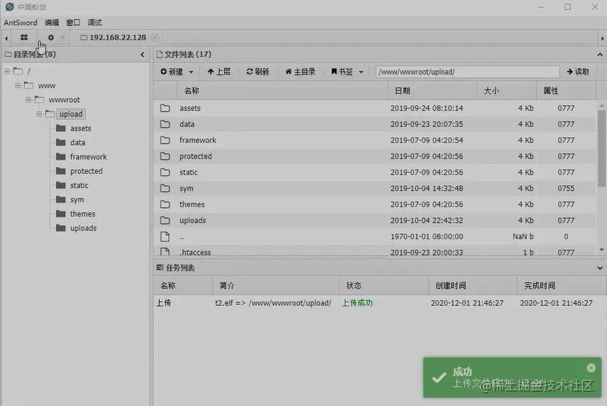 使用蚁剑连接Target2,并上传msf生成的正向后门