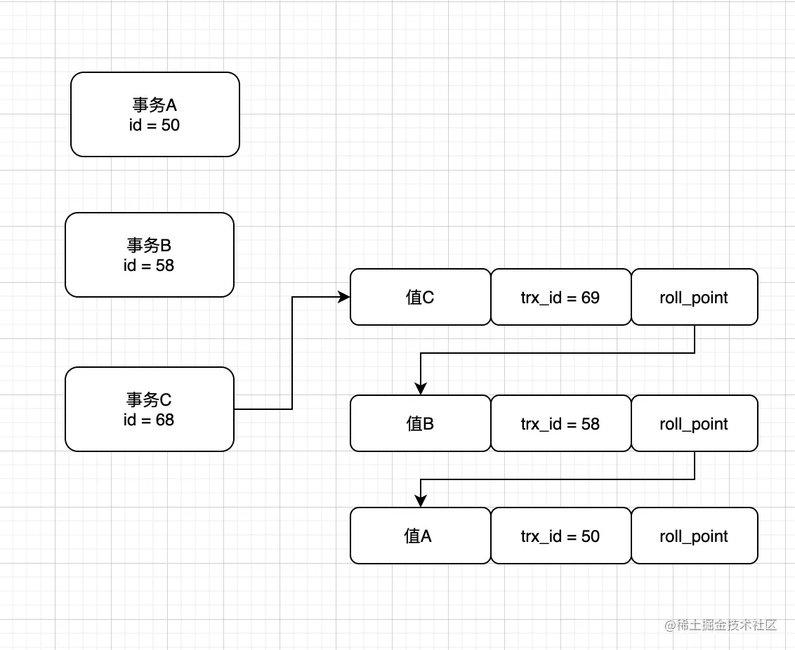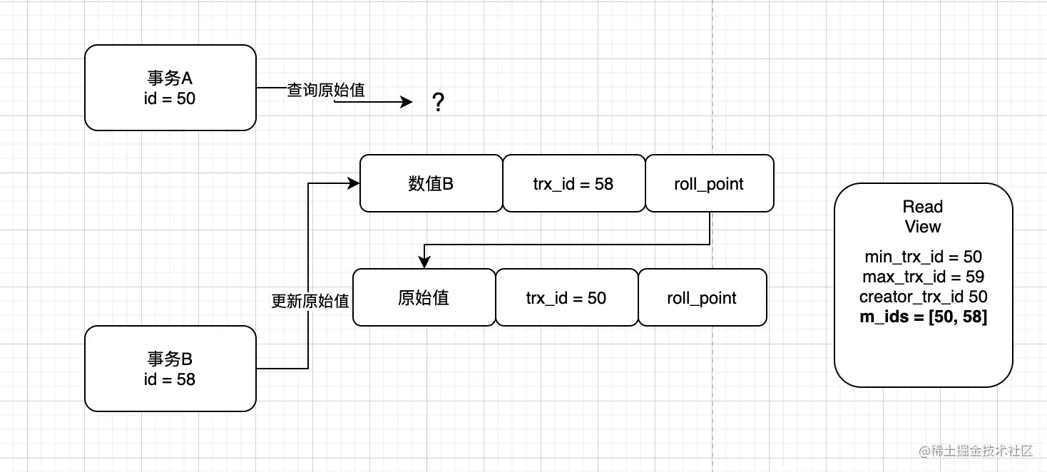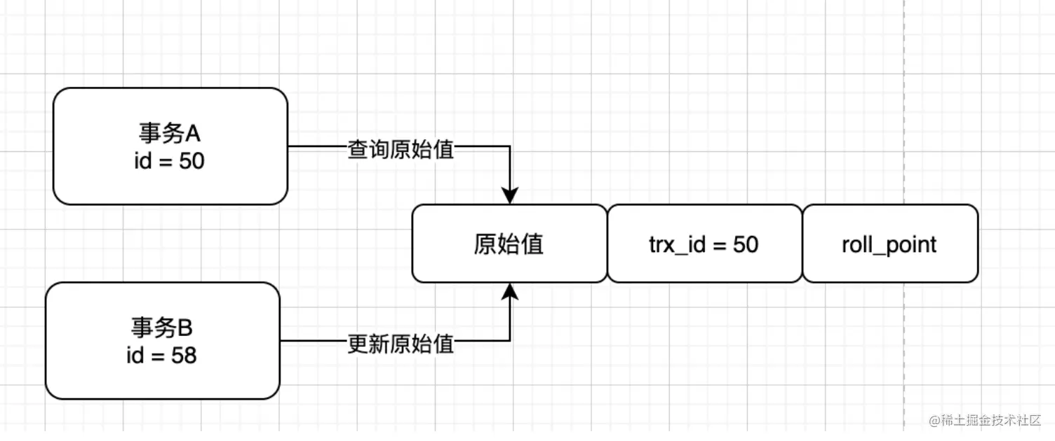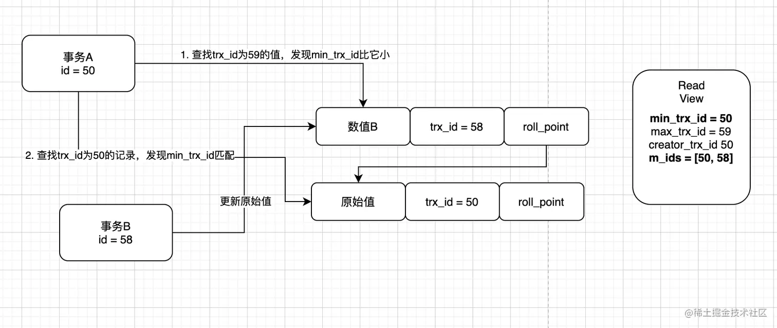 于是事务A就知道这条数据不是他改的,所以它要根据roll_point找到下一条数据(此时可以理解这条数据为事务A操作的快照)并且同样检查他的trx_id是否大于min_trx_id,通过对比发现是和他相等的(都是50),所以可以确定这条数据是事务A修改的数据。最终他的判断结构图如下所示: