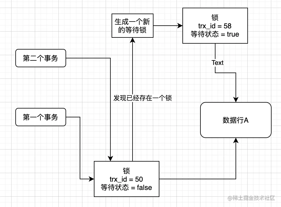 这里我们直接根据一个图进行讲解,当第一个事务访问的时候,此时这个事务就会创建一个锁,里面包含了自己的trx_id和等待状态,然后把锁跟这行数据关联在一 起,同时锁是在内存里面完成操作的,因为操作数据在缓冲区完成的而不是磁盘文件完成。第二个事务过来的时候,发现数据被锁了,所以很无奈,只能进行等待,此时会生成一个锁,并且把等待状态设置为true,表示自己也在等待。关键的一步来了:**事务A执行完成之后会解除锁并且会去找找有没有事务也对这条数据加了锁,结果发现第二条事务也加了锁,于是会去释放这个锁,然后把B唤醒去干活。**这种双锁的设计保证了多线程访问的情况下对于一行数据的访问。