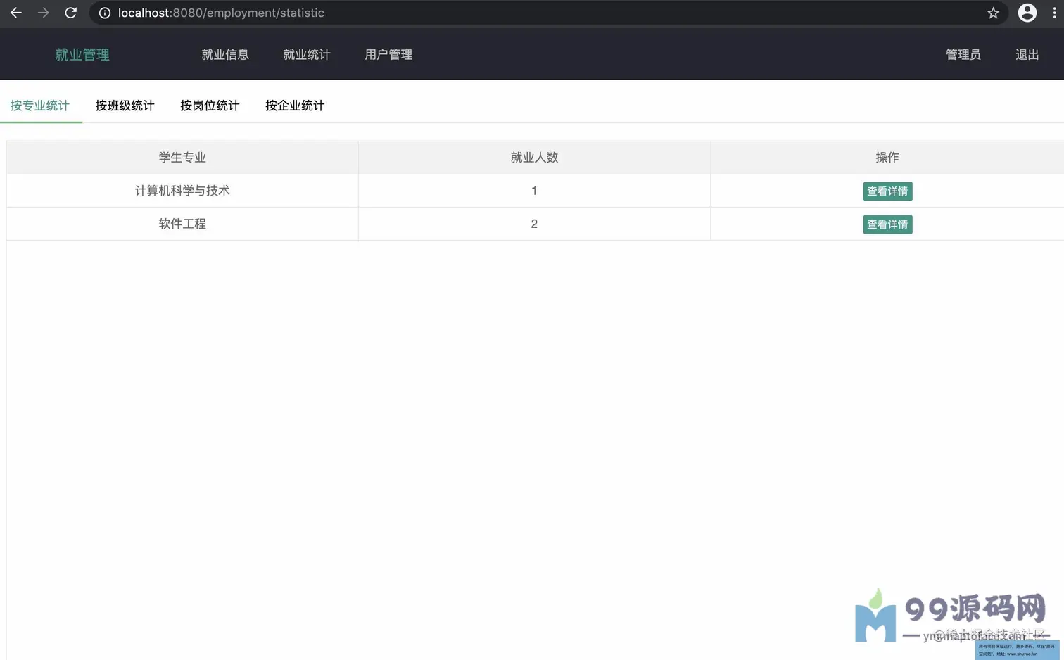 主要处置了各大高校统计应届毕业生就业的问题,功用包括:登录,就业信息管理,就业统计管理,用户管理,就业信息管理中包含了专业,岗位,企业等多个搜索条件,关于打算寻觅毕业设计或者找项目练手的同窗来说,该系统相对功用简单,上手较快。