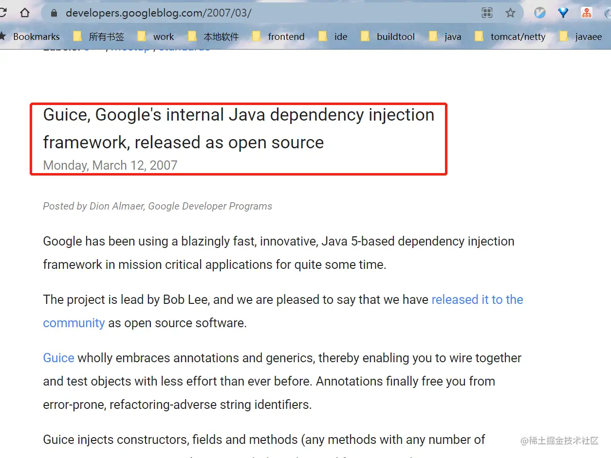 根据wiki的描述,Guice就是依赖注入框架,由google开源。主要特点就是:支持以java注解的方式配置组件及依赖。最早的版本应该是在2007年,我还找到一篇当年的报道 developers.googleblog.com/2007/03/,